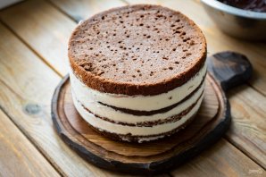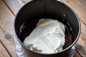 На дно разъемной формы выложите пергамент для выпекания и выложите первый бисквитный корж, пропитайте его любимым сиропом (у меня шоколадный сироп), поверх выложите и распределите примерно 150-200 грамм приготовленного крема. Затем поверх выложите второй бисквит, пропитайте сиропом, потом опять 150-200 грамм крема, затем третий бисквит, пропитайте сиропом, вновь крем и последний бисквит, который тоже пропитайте сиропом.