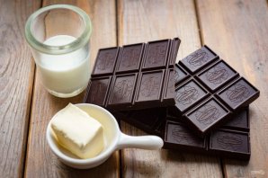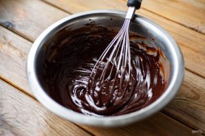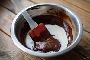 Миску с растопленным шоколадом снимаем с водяной бани, добавляем сливочное масло, вмешиваем его в растопленный шоколад, заливаем молоко комнатной температуры, вмешиваем его.