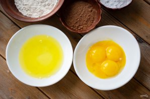 Четыре яйца аккуратно поделите на белки и желтки по сухим, раздельным мисочкам.
