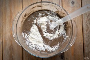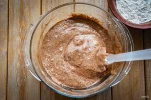 Просейте 100 грамм муки и вмешайте ее очень аккуратно. Воздушное, шоколадное тесто выложите в форму, предварительно выстеленную пергаментом для выпекания.