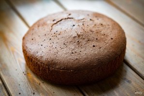 Выпекайте бисквит в уже заранее разогретой до 180 градусов духовке в течение 25-30 минут. Готовый бисквит получается высотой в 5 см. Все то же самое сделайте для приготовления второго бисквита. Оба бисквита следует полностью охладить, обернуть в пищевую пленку и выдержать ночь в холодильнике.