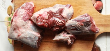 1. Первым делом приступаю к подготовке мяса, беру баранину с костями, прожилками и всеми пленками. Хорошенько мою мясо и помещаю его в казан, заливаю холодной водой, а после закипания добавляю щепотку соли и убираю образовавшиеся пенки.