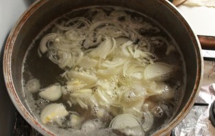 2. Лук очищаю от шелухи и мою, нарезаю тонко, отправляю его в кастрюлю и варю полчаса на медленном огне.