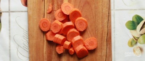 3. Морковку чищу и нарезаю крупно, закидываю ее в кастрюлю, добавляю целый стручок острого перца и все специи по вкусу. Готовлю около 60 минут.