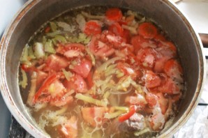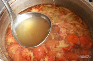 5. Варю шурпу до готовности всех овощей, при этом половником зачерпываю бульон и тонкой струйкой вливаю обратно, таким образом бульон не будет бурлить. По вкусу солю.