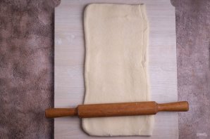 Достаньте тесто из холодильника и прокатайте его скалкой удлиняя.