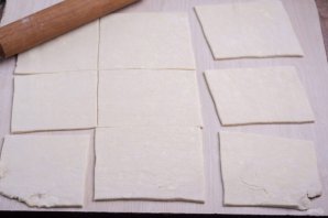 Приготовленное тесто раскатайте в прямоугольный пласт толщиной примерно в 4-5 мм. и нарежьте на квадраты.