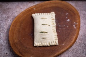 Этой свободной стороной теста накройте начинку и вилкой скрепите края, формируя пирожок.