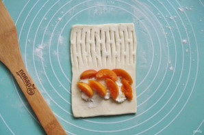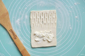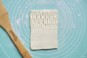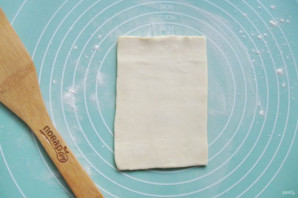 Размороженное тесто слегка раскатайте. Вырежьте пласт размером 10х15 см.