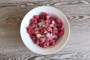 В малину добавьте сахар, перемешайте. Давить или измельчать ягоды не нужно, чтобы не появился сок.