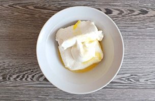 Сделайте творожную начинку. К творогу добавьте сахар, сметану, ванилин, 1/2 часть взбитого яйца. Разомните вилкой и хорошо перемешайте.