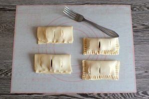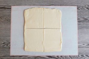 Размороженное слоёное тесто подкатайте в пласт толщиной 0,3 см. Поделите его на 4 прямоугольника.