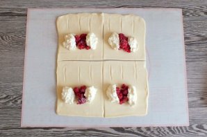 На каждый прямоугольник, в серединку, отступая от края место, выложите начинку. Чередуя, половина столовой ложки творожной начинки, столовая ложка малины и опять половина столовой ложки творожной начинки. На свободной части прямоугольника сделайте прорези.