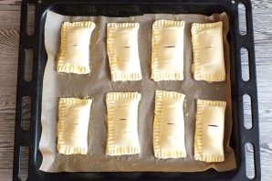 Выложите слойки на противень застеленный пекарской бумагой. Смажьте оставшимся яйцом. Поставьте выпекаться в разогретую до 200 градусов духовку на 20 минут. Учитывайте особенности своей духовки.