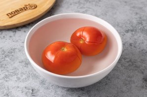 На помидорах сделайте надрез крест-накрест у плодоножки. Опустите в горячую воду на 5 минут, затем окуните в ледяную воду.