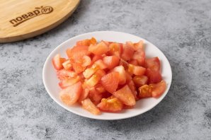 Очистите помидоры от шкурки, а мякоть нарежьте кубиками.
