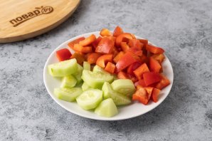 У болгарского перца удалите семечки и плодоножку, нарежьте небольшими ломтиками. Огурец очистите от кожуры и тоже нарежьте ломтиками.