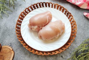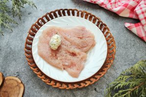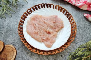 Куриную грудку разрежьте вдоль на две половинки и немного отбейте. Каждую часть посолите и поперчите.