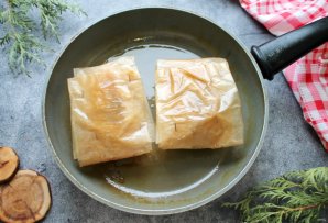Сковороду смажьте немного растительным маслом, разогрейте и выложите конвертики с котлетами. Обжаривайте их с двух сторон на среднем огне до румяной корочки. Примерно по 4-5 минут с каждой стороны. Снимите котлеты со сковороды, удалите конвертики и сразу подавайте к столу.