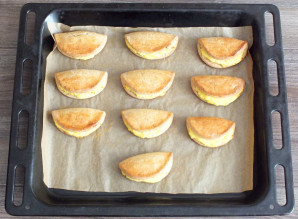 По истечении времени достаньте сочни из духовки. На готовность изделий укажет румяное донышко.