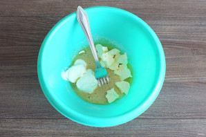 Приготовьте тесто. В чаше соедините яйцо с солью и сахаром. Перемешайте вилкой.