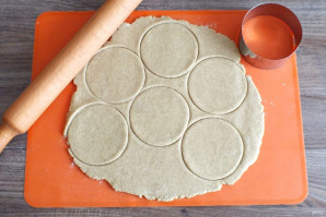 Раскатайте тесто в пласт толщиной 0,3 см. Вырежьте формой круги с диаметром 9 см.