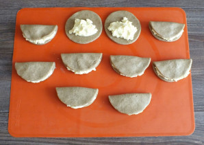 На заготовки разложите по столовой, с горкой, ложке начинки. Прикройте сверху половинкой круга, слегка прижав, тем самым формуя сочник.