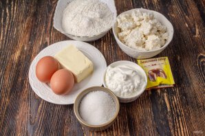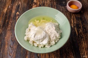 Для приготовления начинки смешайте творог, сахар, ванильный сахар, муку, сметану и яичный белок. Разотрите массу вилкой, чтобы разбить крупные комочки творога.