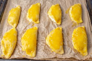 Таким образом приготовьте все заготовки. Переложите на противень, выстеленный пергаментом, смажьте яичным желтком. Поставьте в заранее разогретую духовку до 180 градусов выпекаться на 25-30 минут.