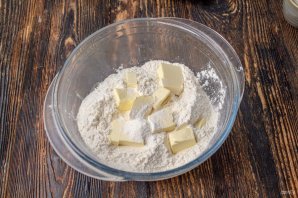 Приготовим первым делом тесто. Для этого в миску просейте муку (1 столовую ложку отложите), нарежьте кубиком холодное сливочное масло, добавьте соль и перетрите в мучную крошку. Делайте это быстро, чтобы масло не подтаяло.