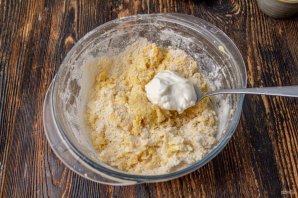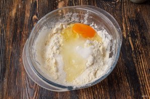 В мучную крошку вбейте куриное яйцо, добавьте сахар и разрыхлитель. Перемешайте.