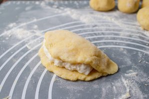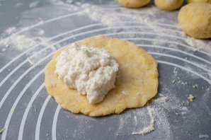 Приступаем к формовке сочников с творогом. Для этого берем один шарик песочного теста, катаем из него круглую лепешку. По необходимости совсем немного подпыляйте рабочую поверхность мукой. На половину лепешки выложите примерно 1 столовую ложку начинки.