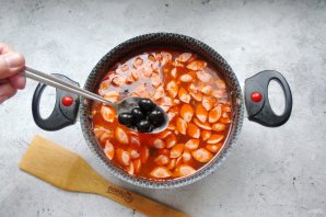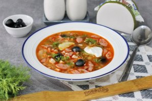 Доведите до кипения и варите солянку 10-12 минут. В конце выложите маслины.