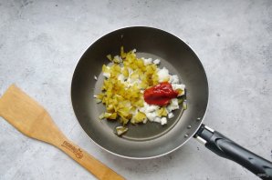 Лук и соленый огурец мелко нарежьте. Выложите в сковороду, добавьте томатную пасту.