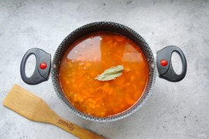 Налейте 500-600 мл. воды. Посолите, поперчите, выложите лавровый лист.