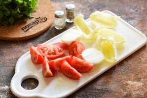 Помидор ополосните и нарежьте произвольно. Лук нарежьте крупно. Перец очистите и разрежьте на 4 части.