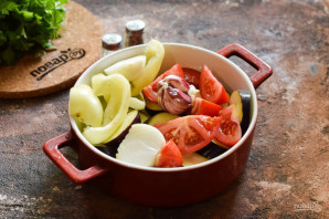 Все подготовленные ингредиенты выложите в форму, добавьте масло и чеснок. Запекайте в духовке при температуре 200 градусов 30-35 минут.