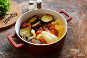 Спустя время достаньте овощи и перемешайте, проверьте готовность. При необходимости запекайте еще 10 минут.