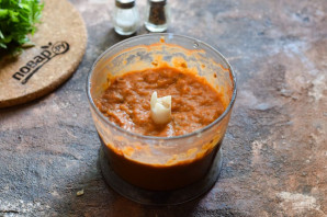 Переложите овощи в чашу кухонного блендера вместе с очищенным чесноком, добавьте соль, перец, немного сахара и томатный соус. Измельчите все на высоких оборотах. Снимите пробу и отрегулируйте вкус.