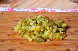 Поставьте яйцо отвариваться до состояния вкрутую. Тем временем нарежьте солёные огурчики. Нужно стараться нарезать их как можно мельче. Для экономии времени можно измельчить их в блендере при помощи насадки с ножами.