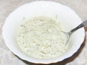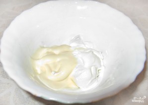 Следующий этап — подготовка основы соуса. Для основы необходимо смешать густую сметану и майонез средней жирности в равных пропорциях. Перемешайте эти ингредиенты, добавив щепотку соли.