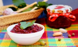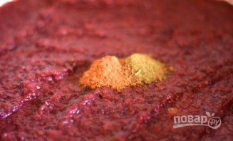 Затем добавьте в соус сахар, хмели-сунели и перец. Перемешайте.