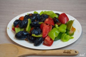 Сливу промоем и удалим косточки, хвостики. Очистим несколько болгарских перчиков. Нарежем удобно. Так же очистим острый жгучий перец. Добавим нарезанные помидоры.