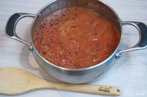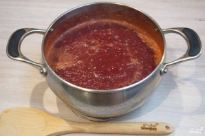 Ставим кастрюлю с массой на небольшой огонь и даем закипеть. Варим 30 минут. Кастрюлю накрывать крышкой нельзя, время от времени нужно помешивать массу, чтоб нижние слои соуса не подгорели. Соус приобретет бордовый цвет. Он уварится сильно и уменьшится в объеме. Теперь добавьте в соус специи (молотый кориандр, черный перец, паприку, орегано, эстрагон, другие). Добавьте уксус, несколько ложек сахара, немного соли. Выдавите через пресс чеснок. Варите около минуты.
