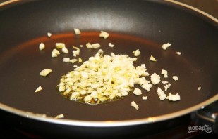 На сковороде разогрейте немного растительного масла, предпочтительнее оливкового. Затем очистите чеснок, нарубите зубчиками острым ножом очень мелко. Выложите чеснок на сковороду и обжаривайте его пару минут.