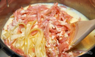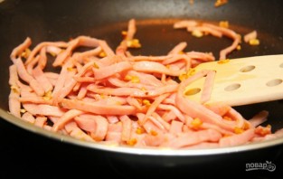 Ветчину нарежьте длинной и тонкой соломкой. Выложите ее в сковороду к чесноку и перемешайте. Обжаривайте ветчину и чеснок пять минут, постоянно помешивая.