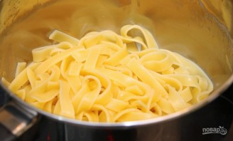 Спагетти или тальятелли отварите. Для этого вскипятите в кастрюльке воду, опустите в нее пасту и варите ее до состояния аль денте, чтобы она осталась внутри немного сыроватой. Откиньте пасту на дуршлаг и добавьте ее в сковороду к остальным ингредиентам.