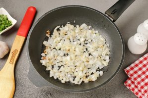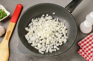 Разогрейте сковороду с маслом и выложите нарезанный кубиками лук.