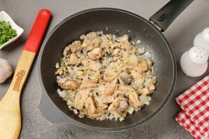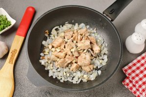 Добавьте разобранную на кусочки рыбу и измельчённый чеснок.