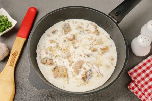 Влейте сливки, посолите и поперчите по вкусу. Доведите до кипения.